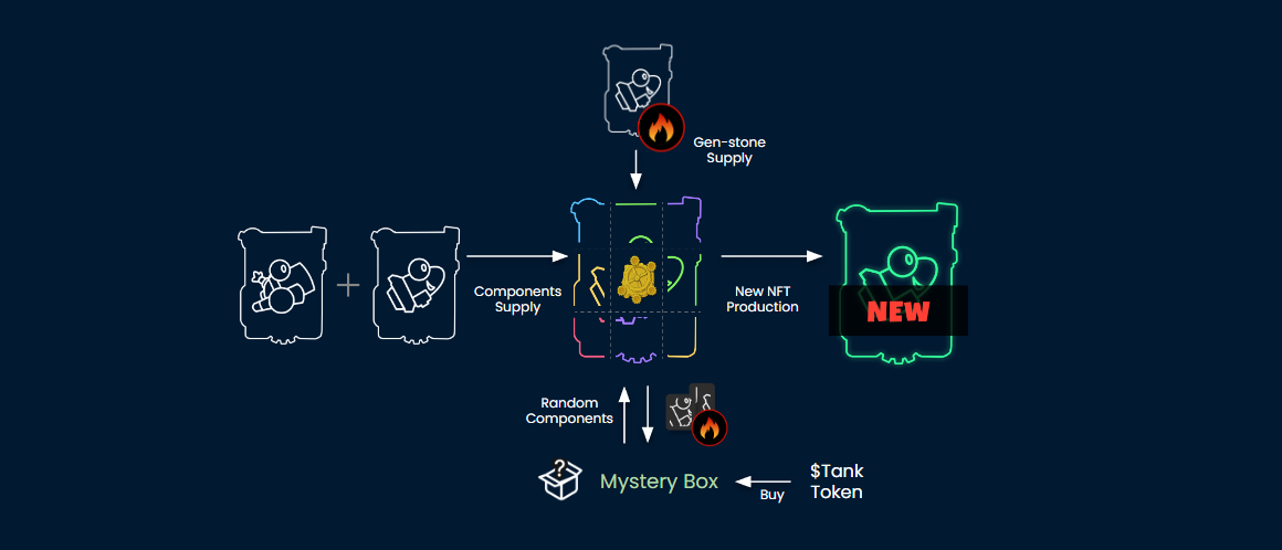 Tank Components are the most basic materials needed to build a new tank. Components can be obtained by combining two tank NFTs. The components created by the combination will randomly inherit the properties of the parent tank. Acquiring by burning can also be considered strategically if you want to create a component of the desired property.\