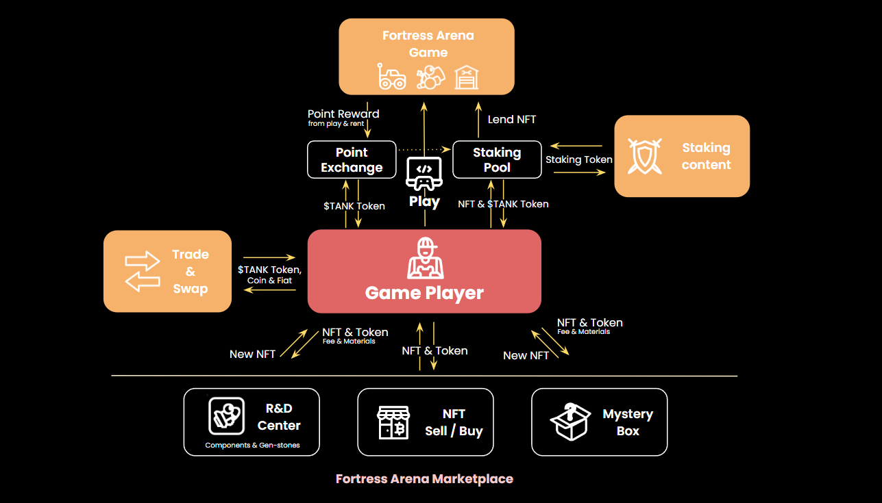 There is a special way of staking in Fortress Arena. The staking pool is directly connected to the rental shop in-game. The in-game rental shop lends users tanks by bringing tanks information staked in staking pools in each chain.&#x20;